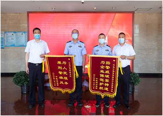 8月10日上午,集团公司培训中心主任孔德明、工会主席郑春梅、租赁公司副总经理刘秀举、综合管理部助理孟醒代表马博足球来到北京市公安局怀柔分局,为怀柔分局雁栖经济开发区派出所和怀柔分局刑侦支队赠送锦旗,锦旗上分别绣有“扬警威破案神速,为企业保驾护航”、“为人民服务,展刑警雄风”的大字,对此次成功破获我集团租赁公司失窃案的全体民警、刑侦警官表示由衷的感谢!